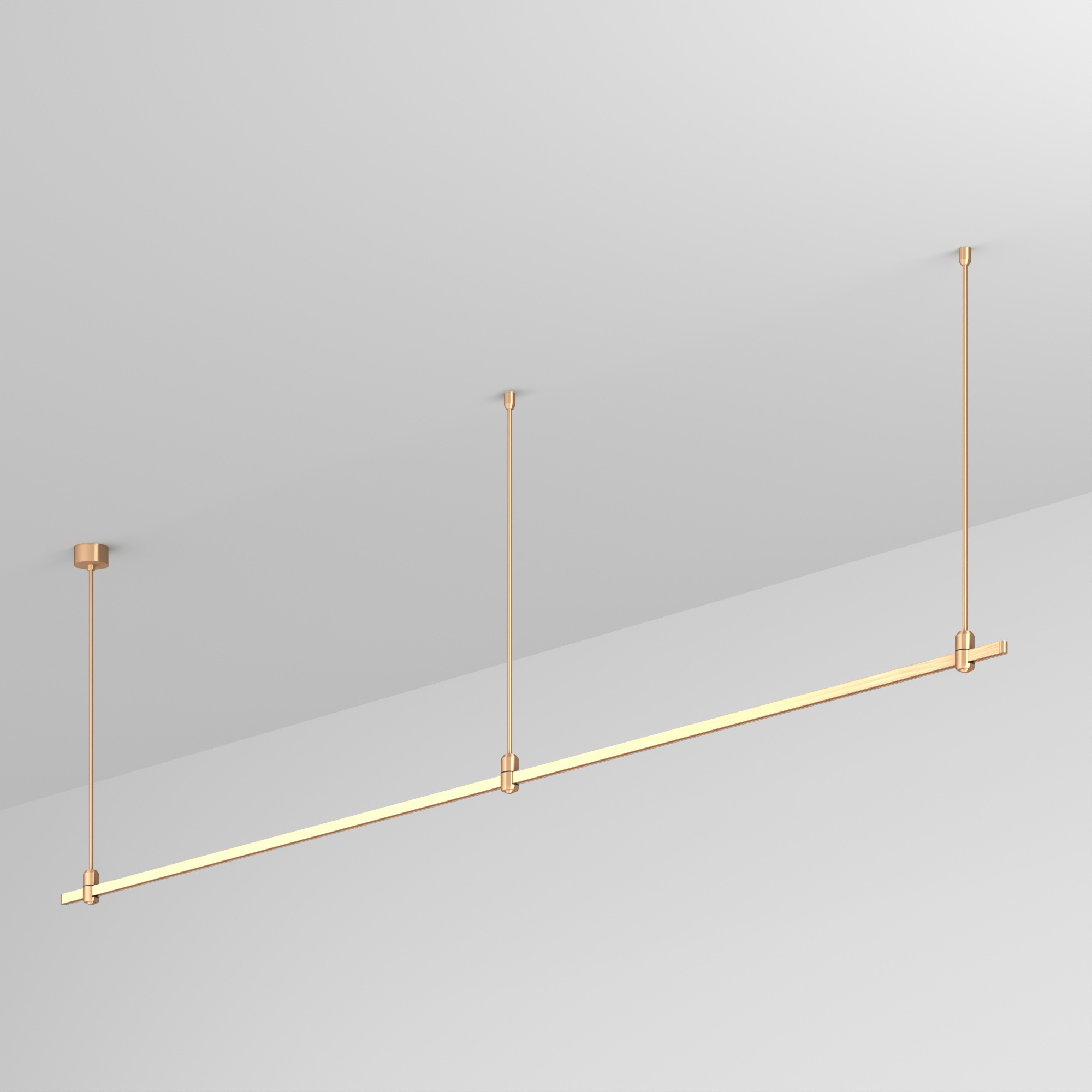 Подвесная линейная конструкция APRIORI. В комплекте трек с аксессуарами и жесткими подвесами длиной 800мм. Размер ДxШxВ: 3000x17x22мм. Размер (с учетом заглушек) ДxШxВ: 3021x17x22мм. Монтируется подвесным способом. Для установки необходима фиксация на потолочной поверхности с использованием трех опорных точек подвеса. Шинопровод рассчитан на работу с безопасным напряжением DC48В. Изготавливается из алюминия, гальванизированного в цвет светлое золото. Светильники и источники питания приобретаются отдельно.