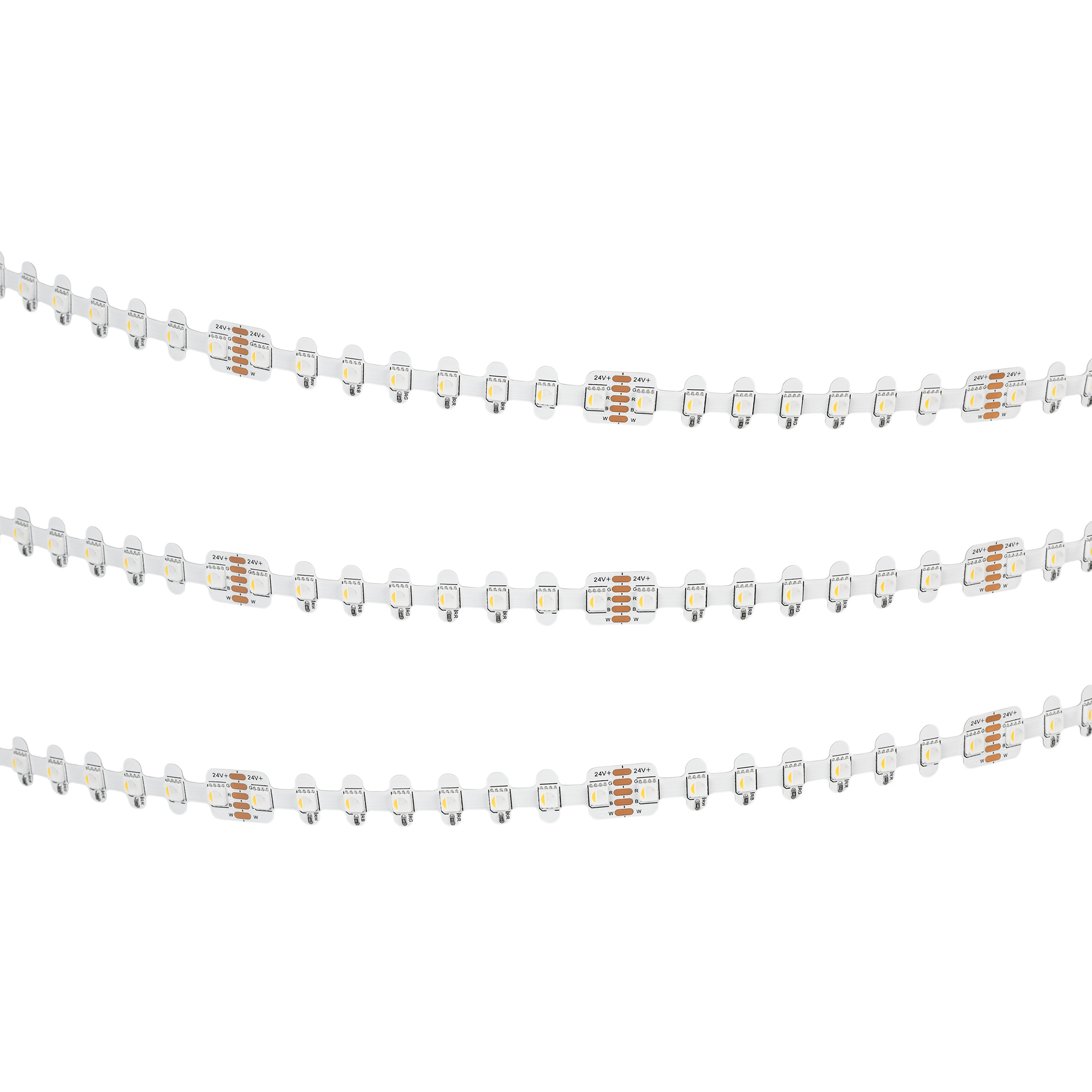 Светодиодная лента RZ-H96 с фигурной платой в форме волны, легко изгибается на плоскости, IP20. Светодиоды 4040, 96 шт/м, белая плата, скотч 3M. Цвет RGB + БЕЛЫЙ 6000 K, индекс цветопередачи CRI>90, угол 120°. Питание 24V, мощность 12 Вт/м (60 Вт на 5 м). Размеры 5000x12x2.2 мм. Мин.отрезок 83.3 мм, 8 светодиодов. Цена за 1 м.