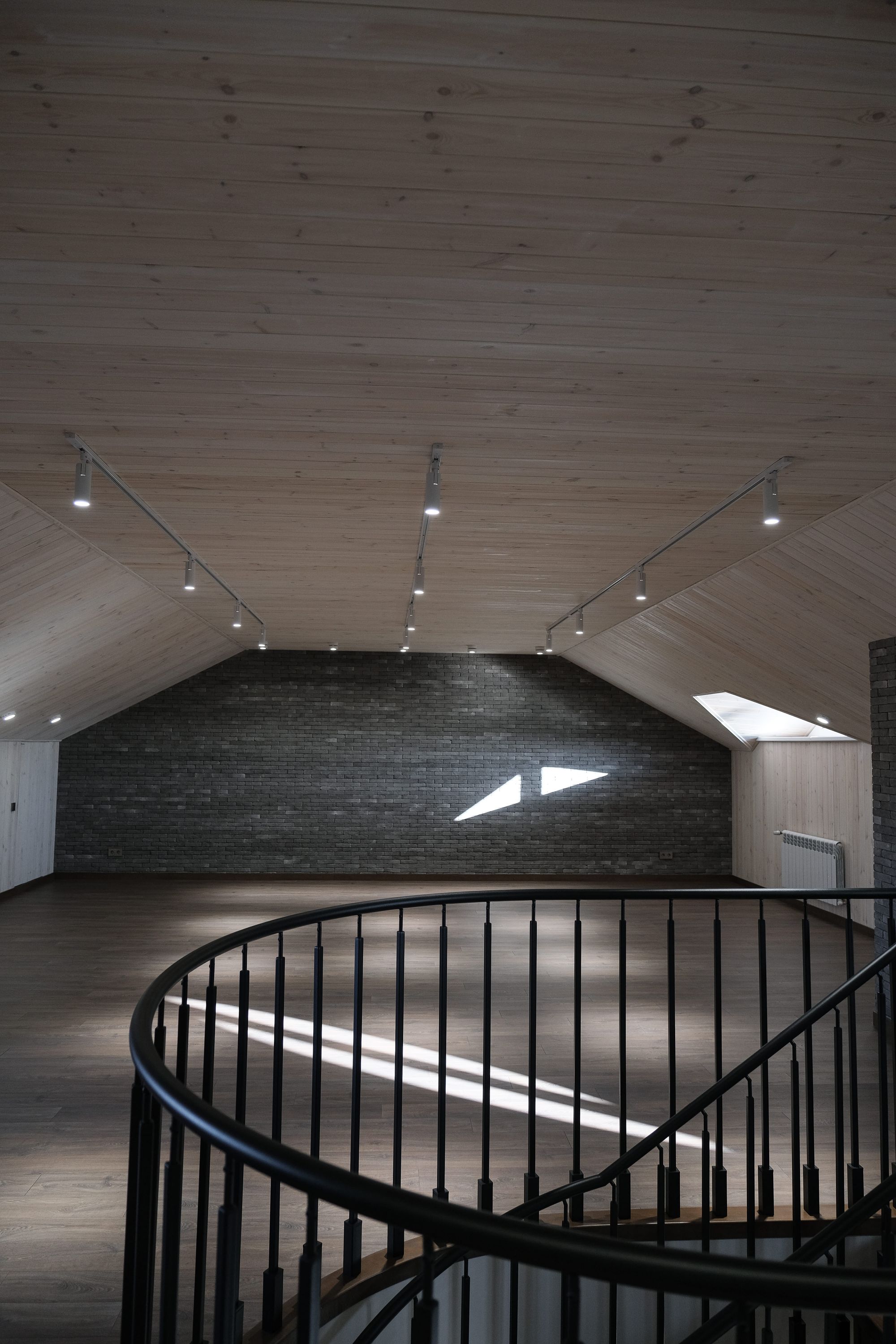 Особым местом в коттедже является мансарда. Отделка стен светлым деревом визуально расширяет помещение и не поглощает свет, который почти не поступает через небольшие окна. Трековые подвесные светильники GERA с узким углом излучения создают локальное освещение в центре комнаты, тем самым не засвечивая пространство. Аккуратные накладные светильники серий MONA и SP круглой формы обеспечивают освещение на участках комнаты с невысоким или скошенным потолком.