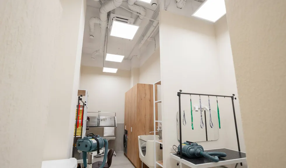 В санузле установили светильники GRIGLIATO и подсветку зеркала, тумбы и ниши в стене. А создать отличную видимость и комфортные условия мастерам, которые проводят груминг-процедуры в рабочем зале, помогли панели INTENSO. «У них торцевая засветка, отличные световые характеристики и равномерное распределение света», — подчеркнула Дина.