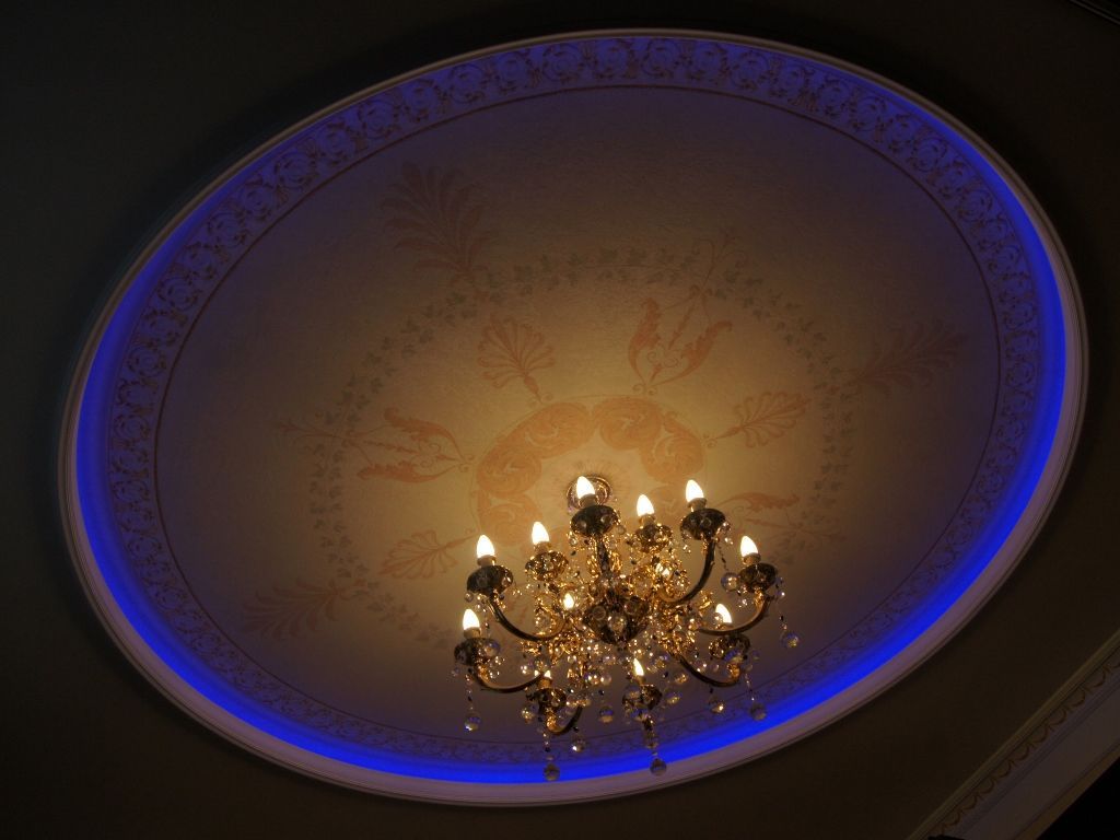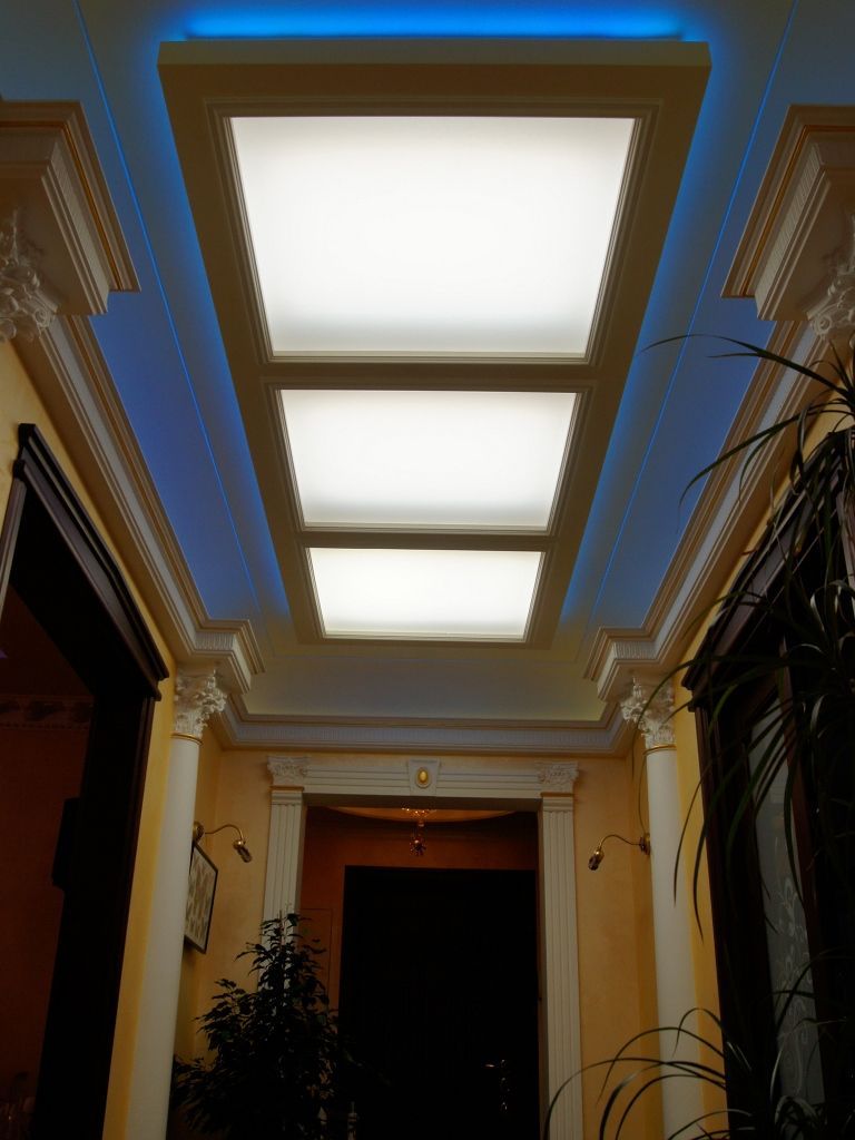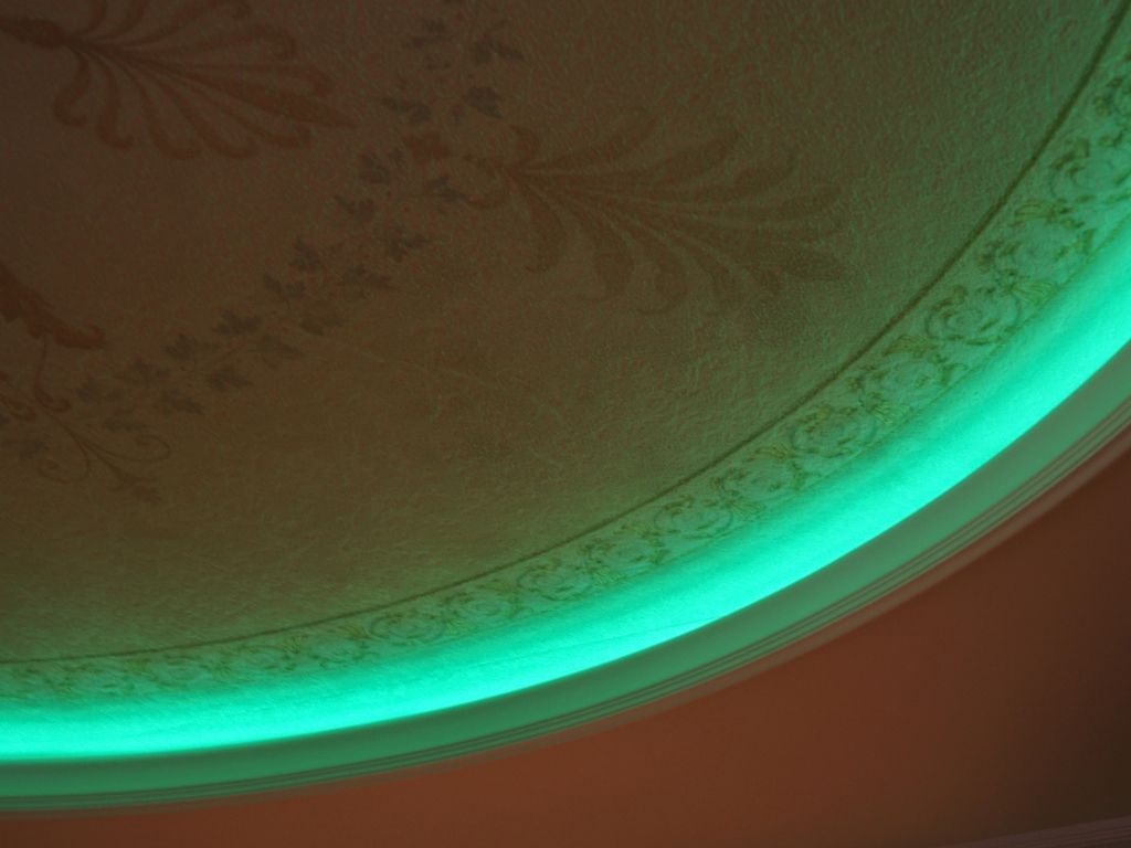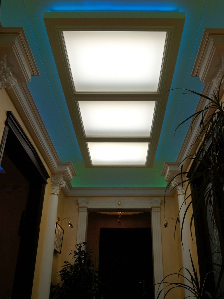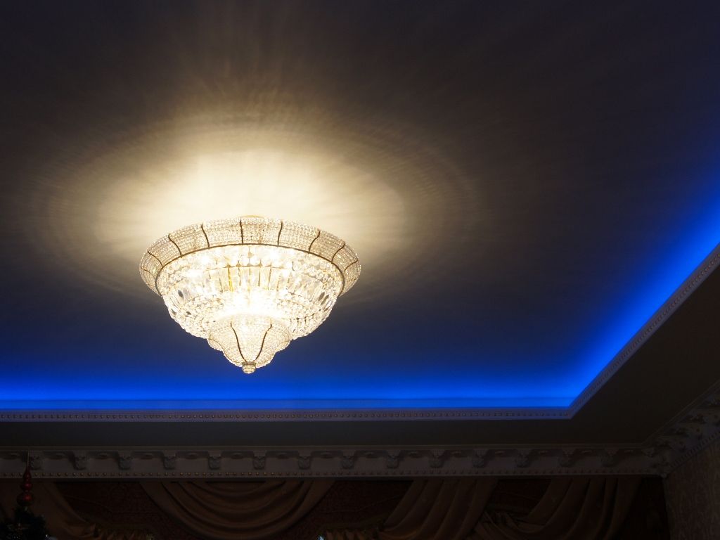В данном проекте сочетание закарнизной многоцветной подсветки и основного освещения на основе классических люстр помогло создать особенный интерьер. Для освещения коридора были применены многоуровневые потолки со светодиодной RGB лентой. В детской комнате было создано звездное небо с многоцветной контурной подсветкой светодиодной лентой и необычными светильниками, меняющими свет за счет примененных в них RGB светодиодов.