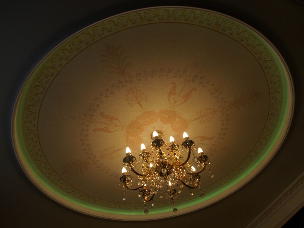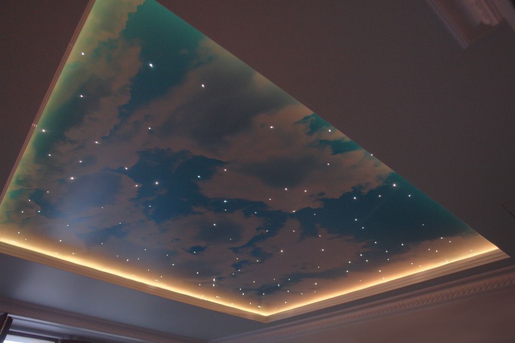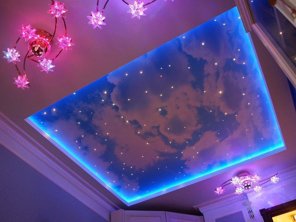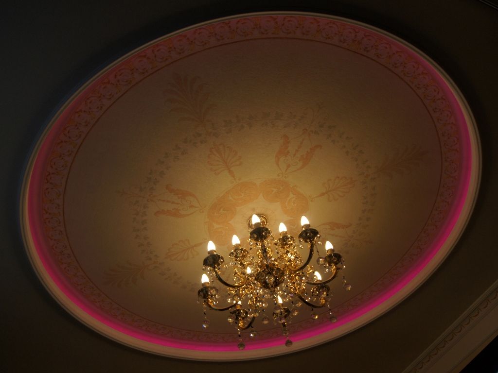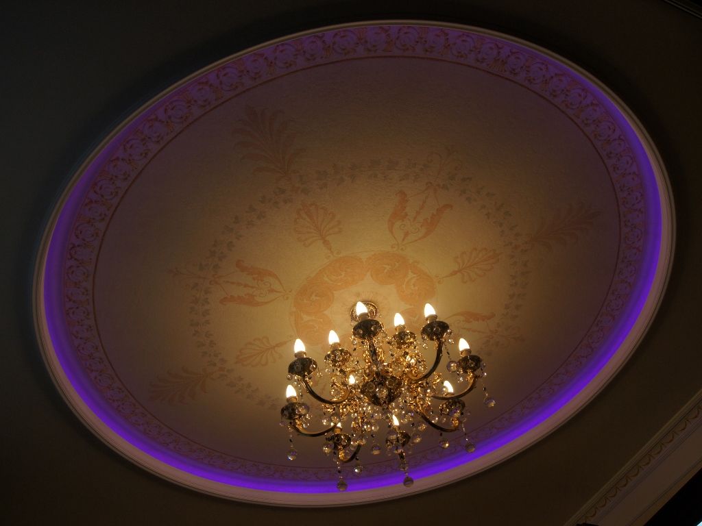 В данном проекте сочетание закарнизной многоцветной подсветки и основного освещения на основе классических люстр помогло создать особенный интерьер. Для освещения коридора были применены многоуровневые потолки со светодиодной RGB лентой. В детской комнате было создано звездное небо с многоцветной контурной подсветкой светодиодной лентой и необычными светильниками, меняющими свет за счет примененных в них RGB светодиодов.